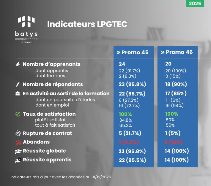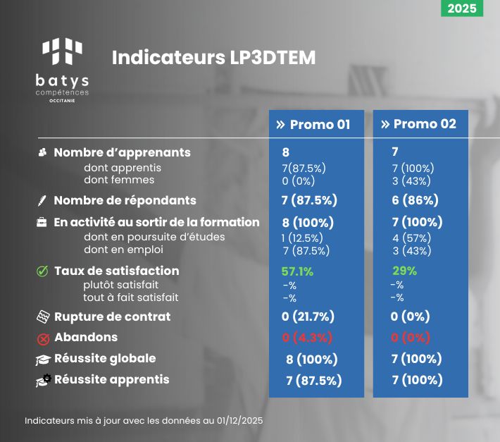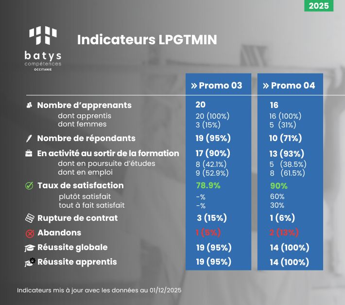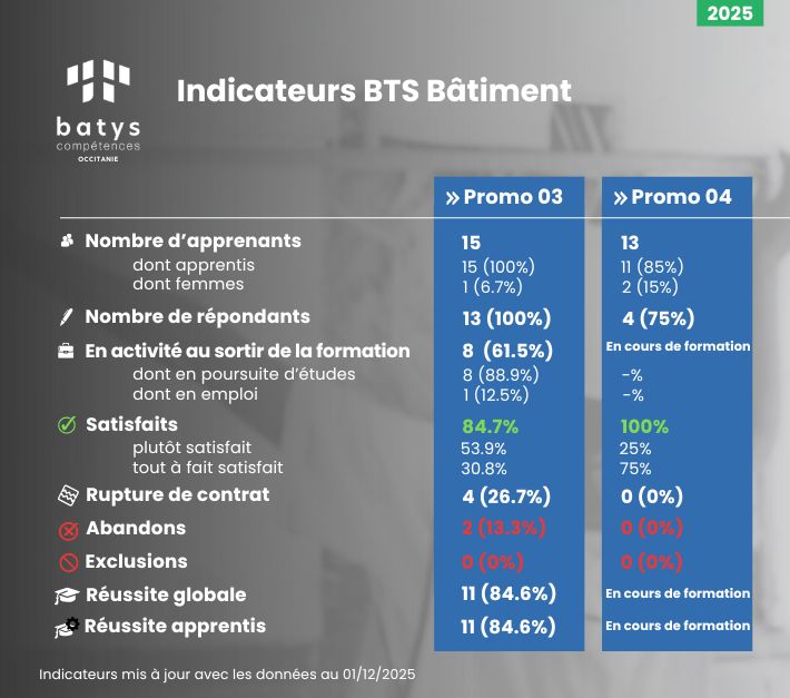 Découvrez l'ensemble des indicateurs de qualité issus des différentes promotions de Batys Compétences Occitanie. Nos enquêtes de satisfaction nous permettent de rester dans une démarche d’amélioration continue, pour vous proposer des formations de qualité.